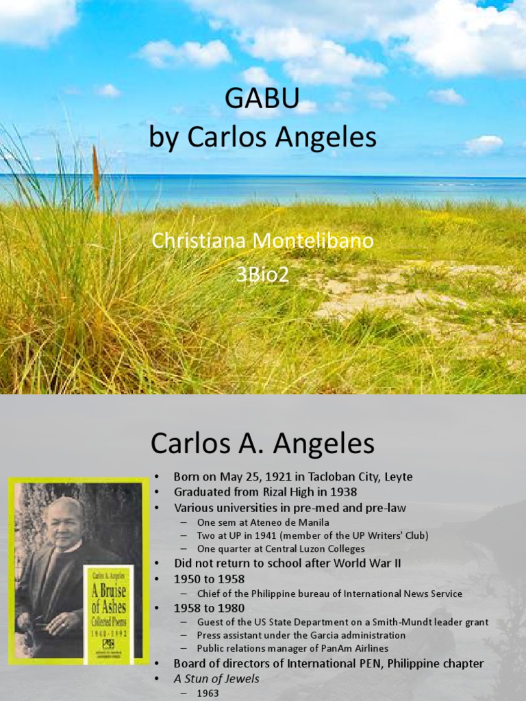 Angeles was born in tacloban city, leyte on may 25, 1921. Gabu by carlos angeles carlos a. She had two sisters, tala and hanan. At gabu, and its pure consistency. Angeles the battering restlessness of the sea insists a tidal fury upon the beach at gabu, and its pure consistency havocs the wasteland hard within its reach.